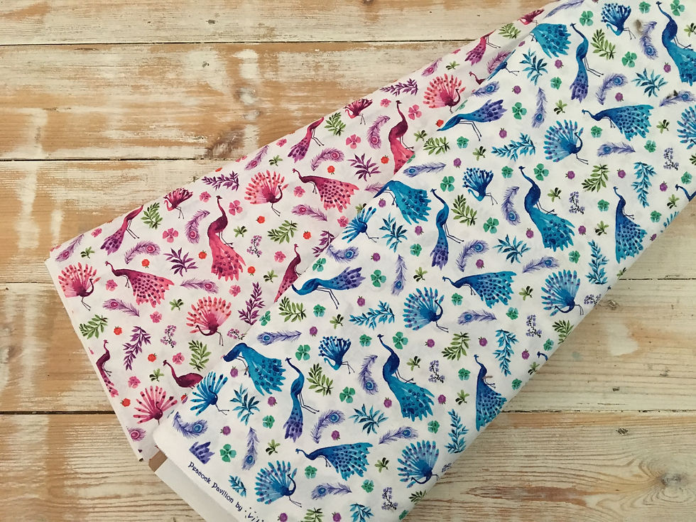 I recently took my first trip to a craft and fabric wholesale show at the NEC and came across a fabulous ribbon and trim store. I instantly thought of this peacock fabric when I saw the pom poms and then I had to make my order up; I now I have very pretty collection of ribbon and pom poms. Oops! I did my best to match up ones that I knew would work with my fabrics so you have a one stop shop for your sewing projects.