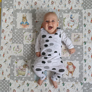 It has taken me several months of trial and error to come up with a pattern that I am happy with, but I am finally ready to share this romper pattern with you. I was given some organic cotton jersey by the Craft Cotton Company to have a play with. It is a great baby print, white with black clouds on. It is always hard to get a feel for a fabric like jersey and you often get what you pay for when it comes to jersey. However, the Craft Cotton Company have managed to produce an excellent quality organic jersey at an affordable price at under £10 per metre. The whole range has proved popular and has washed really well.