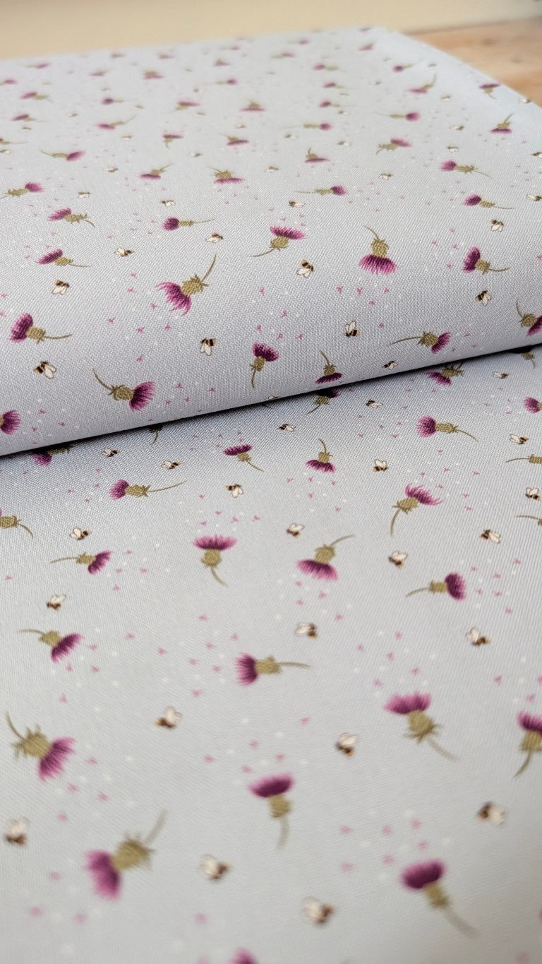 A classic Highland-inspired check in warm lilac heather tones. Scattered on the fabric are multidirectional highland Cows. This print works beautifully as a blender, backing, or binding fabric, and adds a traditional touch to quilts and home décor.